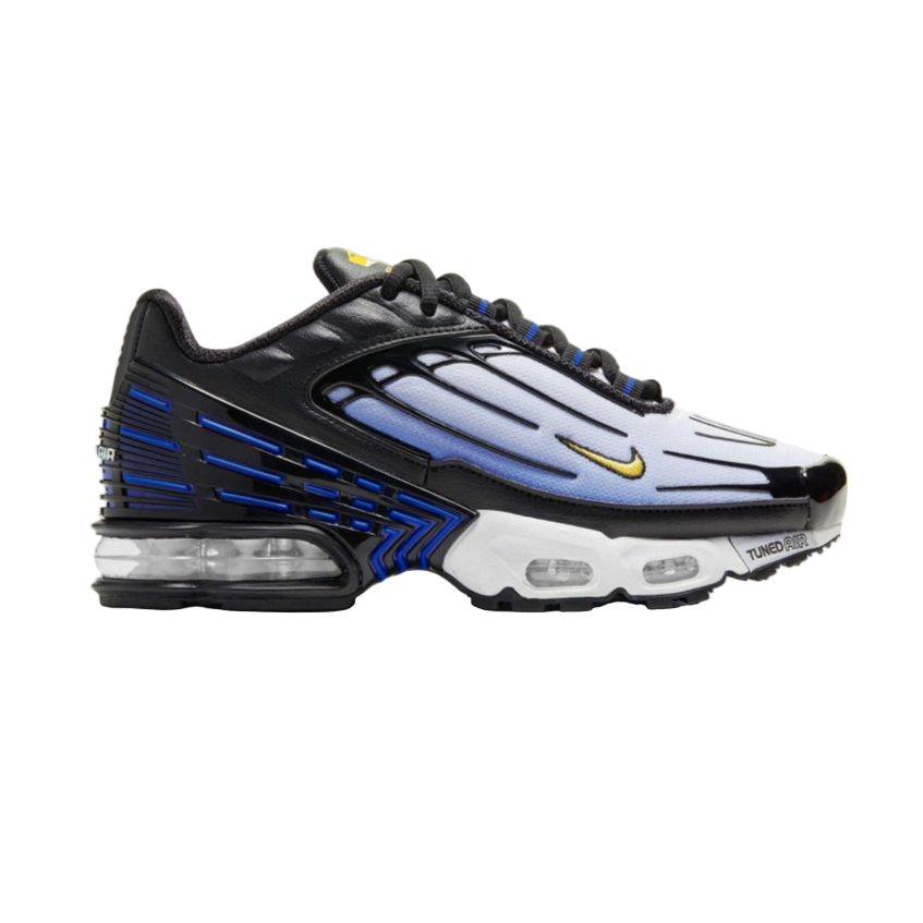 A Nike Air Max Plus 3 "Hyper Blue" (GS) a klasszikus Tuned Air örökségét viszi tovább modern részletekkel és ikonikus megjelenéssel. A kékből feketére váltó színátmenetes felsőrész és a TPU merevítők erőteljes, dinamikus stílust adnak, miközben a hálós és szintetikus anyagok tartósságot és kényelmet biztosítanak. Az Air Max légpárnák maximális ütéscsillapítást nyújtanak minden lépésnél, a gumitalp pedig stabil tapadást garantál. Ez a modell kifejezetten fiatal sneaker-rajongóknak készült, akik a mindennapokban is szeretnének kitűnni a tömegből egy merész és időtálló sneakerrel.